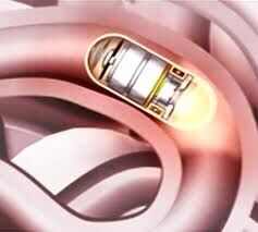 La cápsula endoscópica es una microcamara de aprox. 2 cms (como una cápsula de medicamento grande) y tiene en su interior una luz y una bateria. Las imágenes se transmiten a través de la pared del abdomen y se graba en un aparato portátil que lleva el paciente.